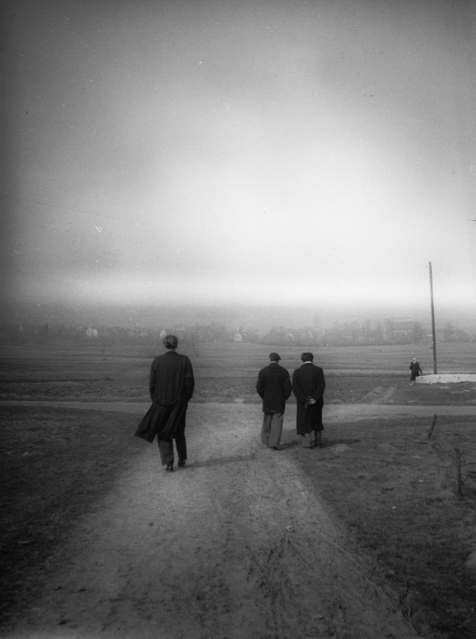 Adolfas Mekas, Jonas Mekas with Friends (Algirdas Landsbergis, Leonas Letas), Kassel/Mattenberg D.P. Camp (1948), gelatin silver print, 55.9 × 43.2 cm